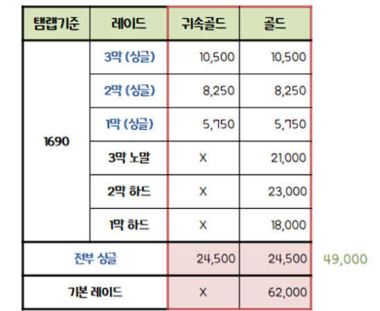 1690, 1~3막 싱글모드와 3막 노말, 2막 하드, 1막 하드를 돌아 총 62000골드를 획득하실 수 있습니다.