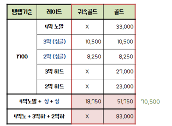 1700입니다. 4막노 + 3막하 + 2막하로 총 83000골드를 획득하실 수 있습니다.