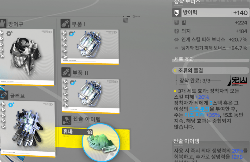 장비의 경우, 아델리아는 취약을 쉽게 부여할수 있지만 식양의 숨결 세트는 이미 자이히가 장착하고 있으므로 중복해서 사용 할 시 버프 중첩이 안되서 사용하지 못한다.