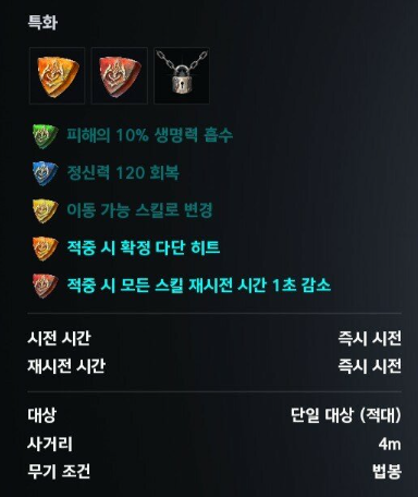 PVE이기 때문에 생명력 유지가 중요해 3번 특화를 사용하며 스킬 포인트 투자 시 쿨타임 감소 외에 큰 이점이 없어서 PVP가 아니면 우선수위가 낮은 스킬입니다.
