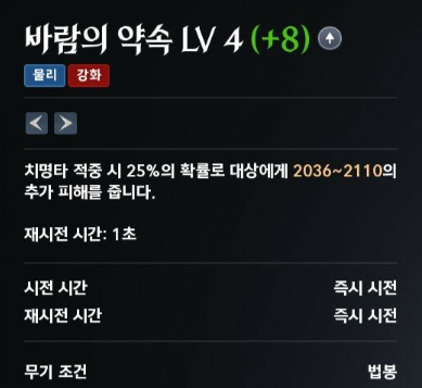바람의 약속은 2순위 스킬이며 치명타 적중 시 확률적으로 추가 피해를 주기 때문에 부족한 공격 능력에 보탬이 됩니다.