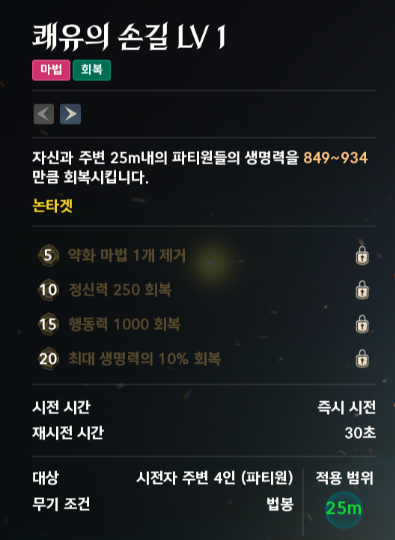 1.5순위 스킬인 쾌유의 주문은 즉시 힐에 도트 힐, 짧은 쿨타임으로 활용도가 높은 회복 스킬입니다.