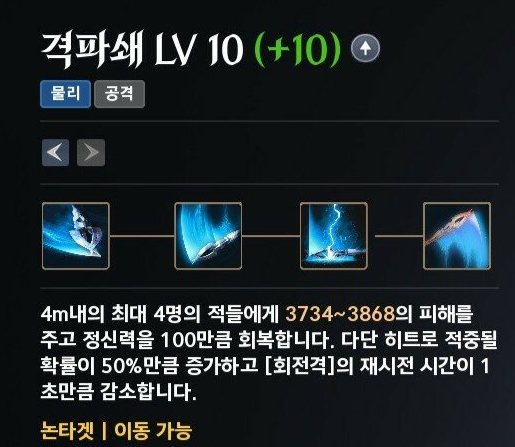 적중 시 정신력을 회복하는 스킬로 기본 3타로 구성되어 있으며 5번 특성을 사용해 4타까지 사용이 가능한데요.