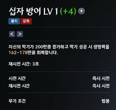 3순위인 십자 방어는 막기 스탯을 증가시키고 막기 발동 시 생명력을 일정 수치 회복하는 스킬입니다.