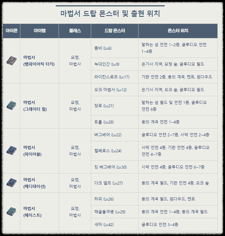 특히 레벨 15에서 20 사이의 유저들이 마주하는 레벨 30 이하의 특정 몬스터들은 마법서들을 드랍하므로, 이를 미리 파악해두면 성장과 경제 활동 모두에서 큰 이득을 챙길 수 있다. 초반 단계에서 습득 혹은 판매를 위해 체크해야 할 주요 마법서 5종의 정보를 정리했다.