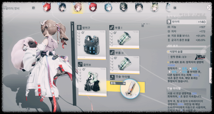 주스탯이 민첩인데 지능 스탯이 달린 장비를 쓴 이유는 재능 노드중에 연계 스킬을 쓰면 스킬 포인트를 주는 패시브가 있고, 반환해주는 스킬 포인트 계수가 지능 스탯에 영향을 받습니다. 어차피 딜이 쎈 캐릭터는 아니니까 과감히 주스탯 버리고 궁극기 충전 효율 + 지능 스탯 몰빵하시는것이 효율 좋습니다.